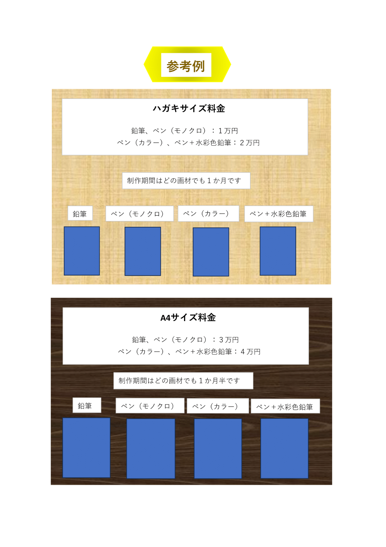 〇「参考例」からお好みのサイズ、お好みの画材をお選びください。