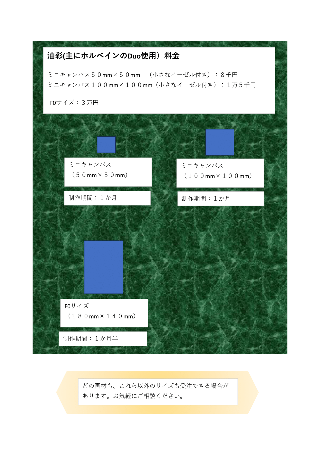 〇製作するサイズ、画材の変更は対応しておりますが、製作期間を延長させていただく場合がございます。